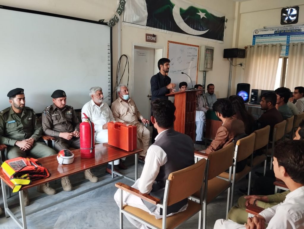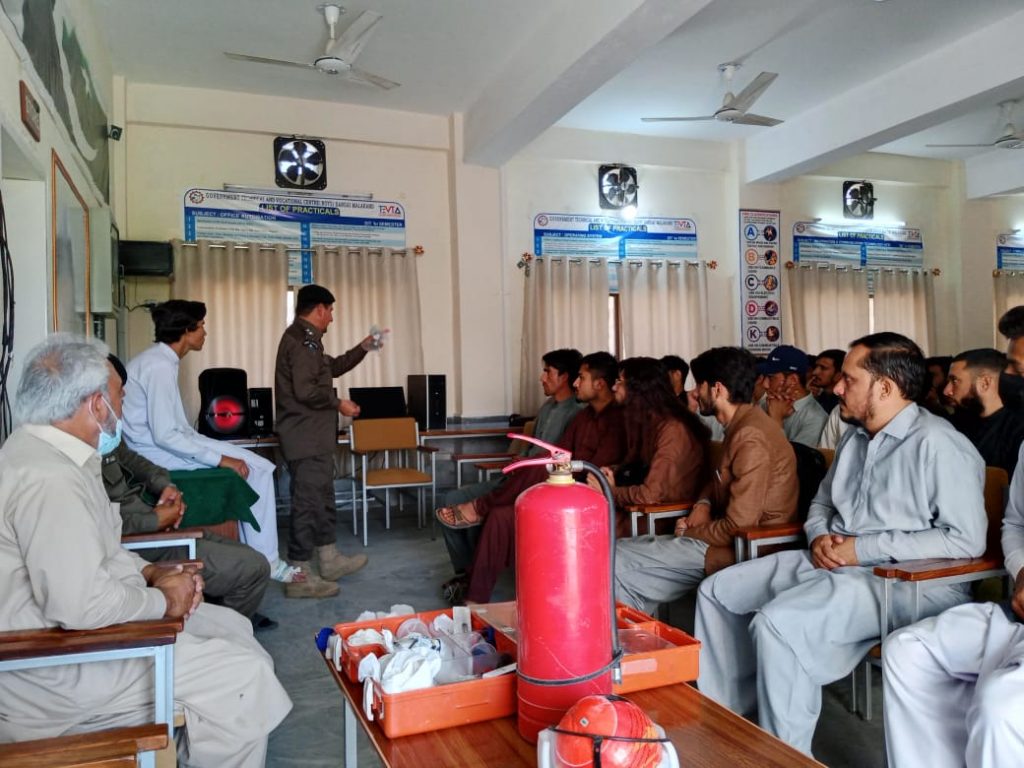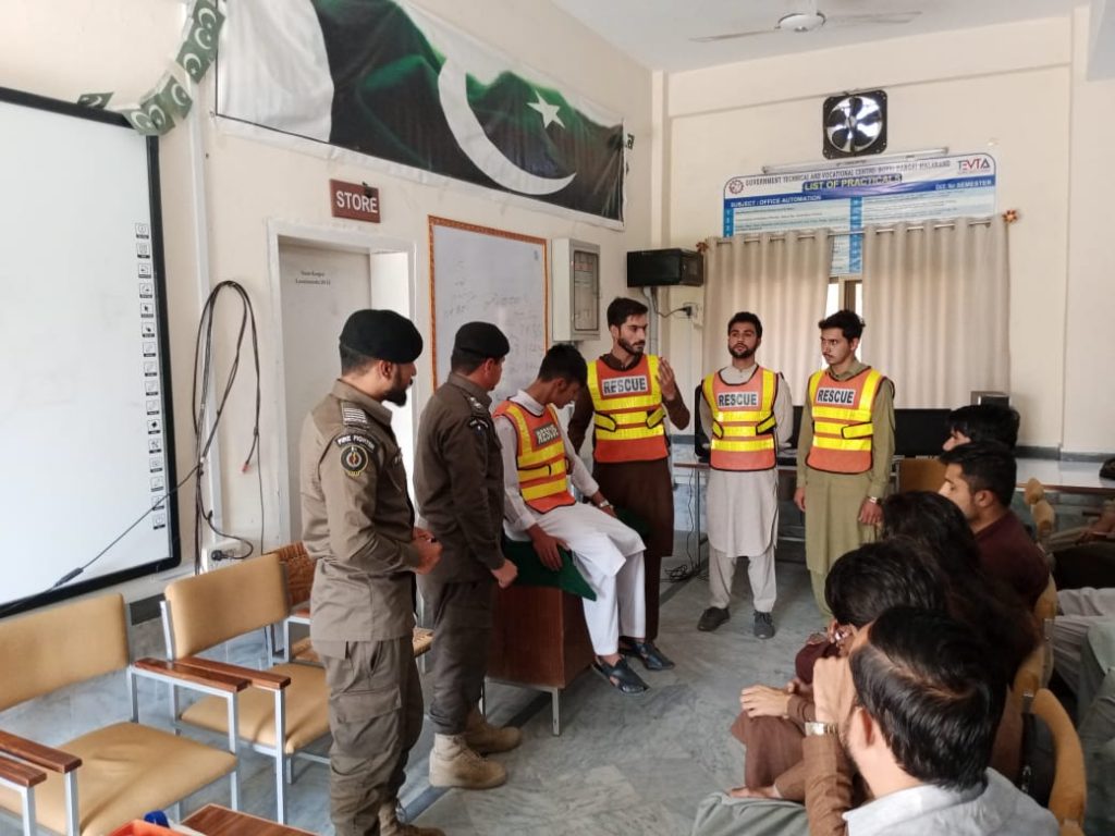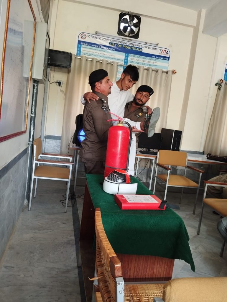 On the request of Principal Muhammad Saleem Khan, Today, on November 2, 2023, Rescue 1122, Malakand senior district emergency, was trained by the government technical and vocational center in Dargai for students with initial physical assistance (first aid) and fire protection.